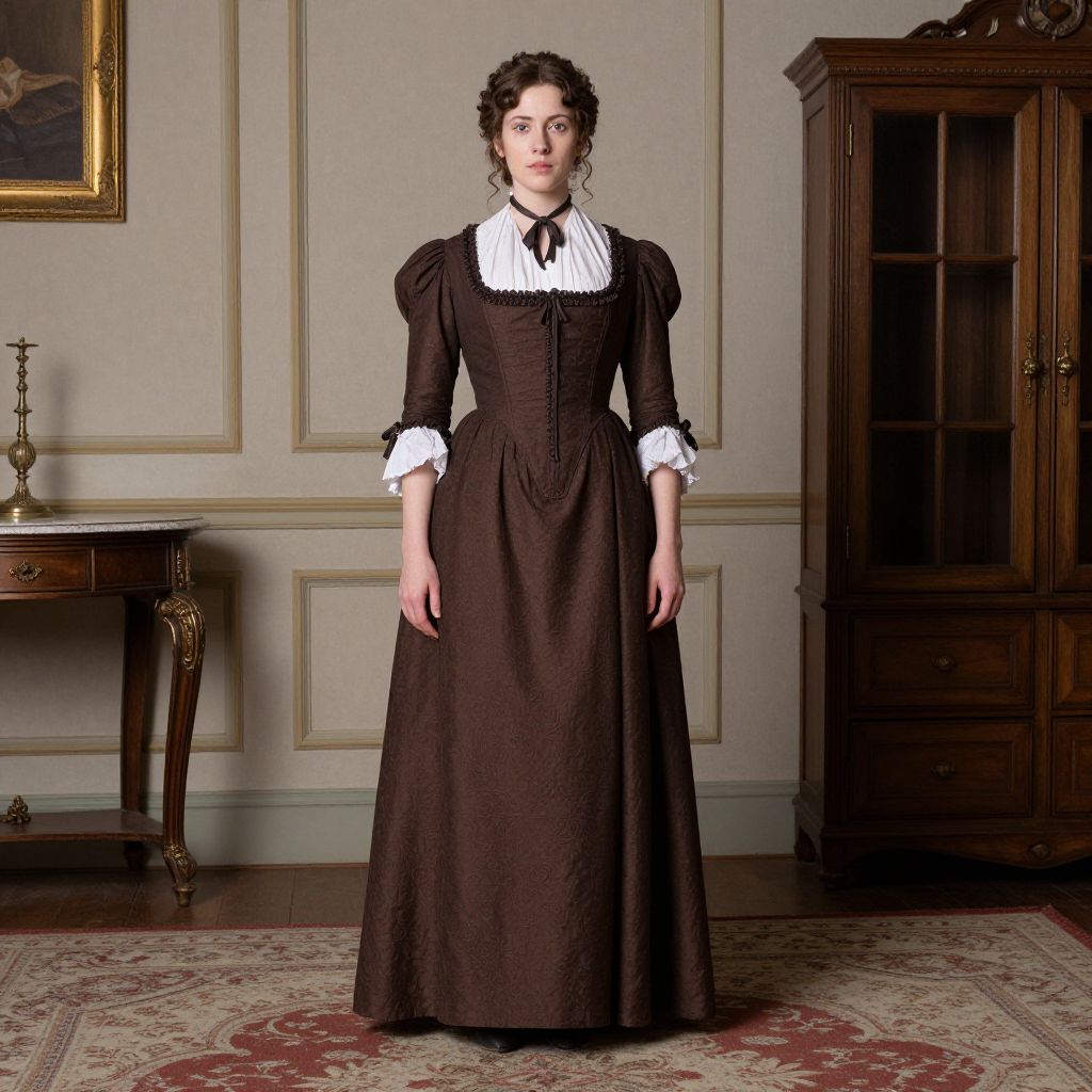 Photograph of a woman standing in a classic, elegant room. She has pale skin, dark curly hair, and wears a dark brown, Victorian-style dress with puffed sleeves and white lace cuffs. The dress has a high collar with a black ribbon bow at the neck. She stands on a patterned red and beige rug, in front of a wooden cabinet with glass doors on the right, and a wooden table with a candlestick on the left. The walls are cream-colored with decorative molding, and a framed painting hangs above the table. The overall style is vintage and sophisticated.