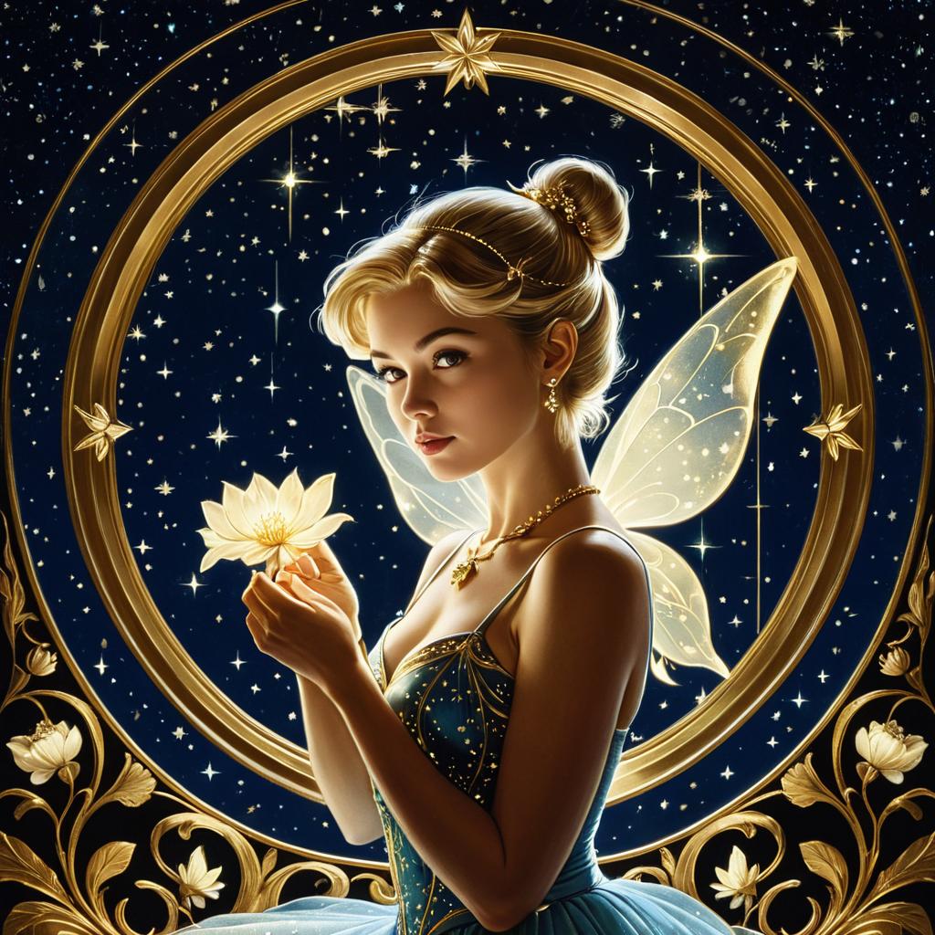 Diana argon as tinkerbell glowing, a beautiful art nouveau portrait by gil elvgren and hajime sorayama, moonlit starry sky environment, centered composition, defined features, golden ratio, gold jewlery, photorealistic professionals lighting, cinematic, sheer glass flower silk, light effect