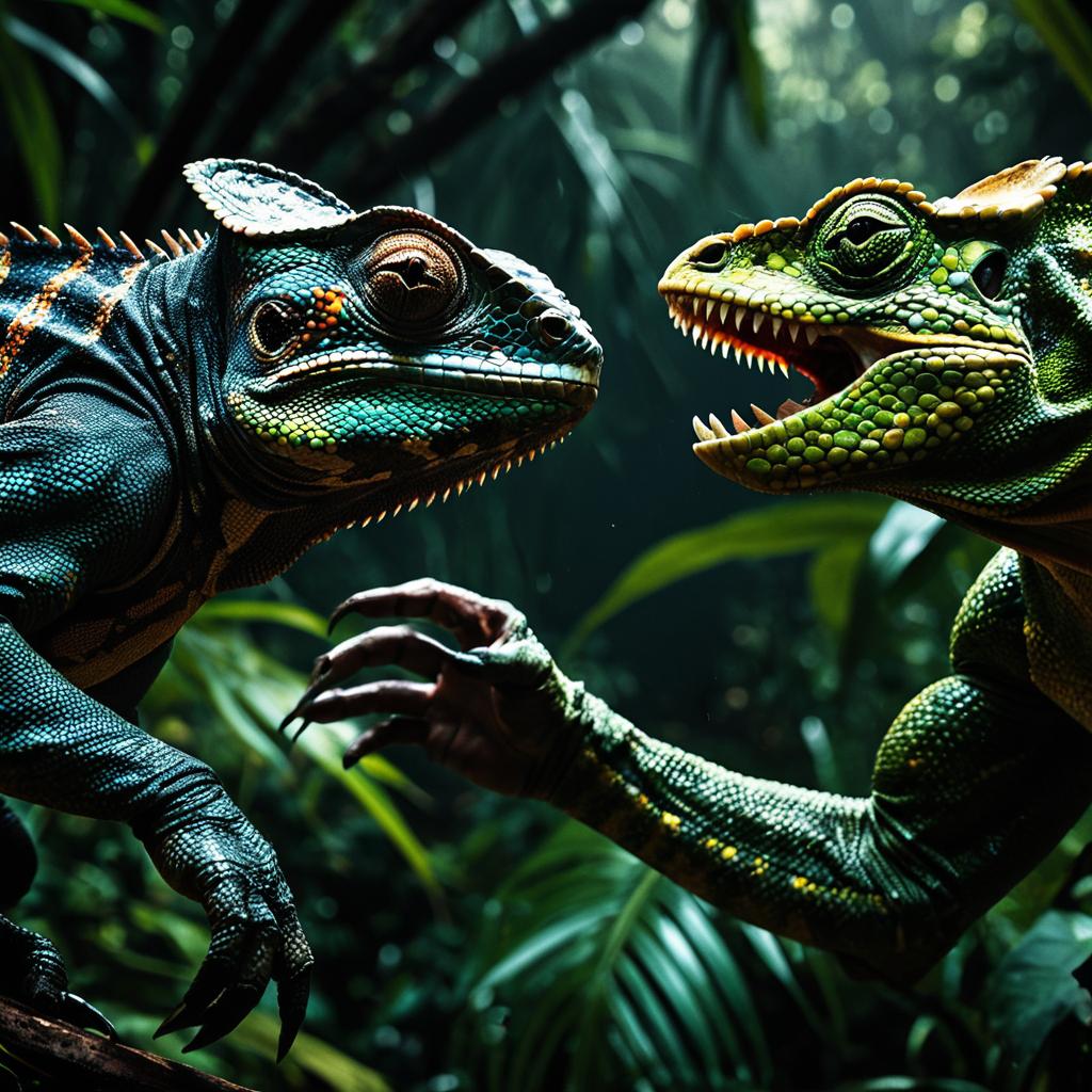 Close-up view of two colorful and detailed chameleons facing each other in a dark, dense jungle setting. The image showcases the textures and vivid patterns on their skin with dramatic lighting and deep shadows, capturing a tense moment of confrontation. The scene is richly detailed with natural foliage in the background, emphasizing a hyper-realistic and cinematic atmosphere.
