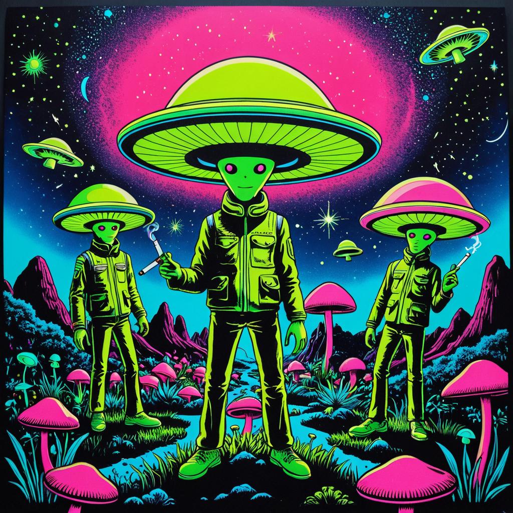 Vintage 70s black light poster of little green men, smoking joints, alien landscape, UFO flying saucers, psilocybin cubensis mushrooms, vibrant trippy colors, electric lime and fuchsia, cosmic galaxies