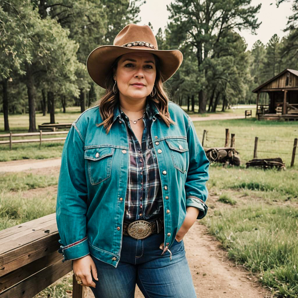 Photo of a Plus-size woman, Choppy Cut hair, cowgirl outfit, wide-brimmed hat, Teal denim jacket, plaid shirt, leather moccasins, fringe details, western belt, rustic style, Canvas materials, casual, country fashion, Down country lane, Polaroid snapshot