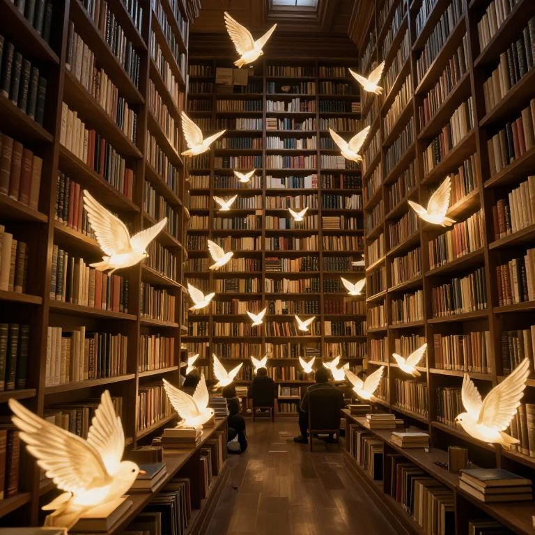 Photograph of a dimly lit library with tall, wooden bookshelves filled with books on both sides. Numerous glowing, white, illuminated bird sculptures are suspended in mid-air, creating a magical atmosphere. The birds are evenly spaced, with their wings spread wide, appearing to fly. Two dark silhouettes of people, likely readers, sit on wooden benches at the center, focused on books. The floor is made of polished wood, and the overall scene evokes a sense of enchantment and tranquility. The background shows dense, tightly packed bookshelves reaching to the ceiling.