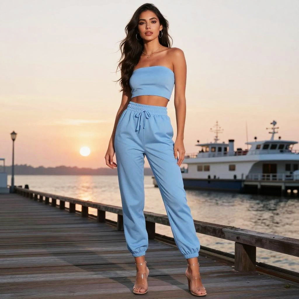 A woman in a sky blue two-piece set, strapless cropped top and high-waisted joggers, clear strappy high heels, captured in a sunset photography at the pier, in the visual style of Kodansha comics. Sexy. Pretty face and beutiful eyes