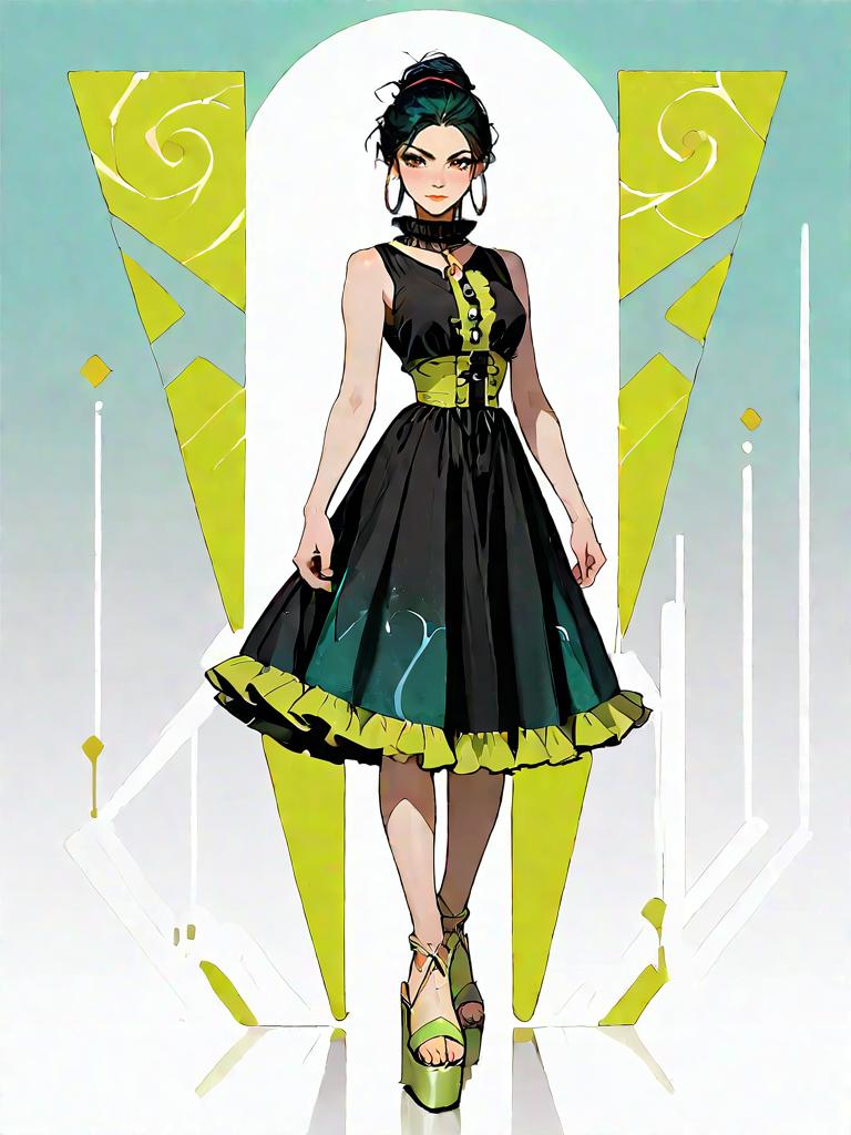 Illustration of a woman in a sleeveless black maxi dress with ruffled collar and armholes, gathered waist, and flowy skirt with ruffled lime green hem. She wears lime green open-toe platform sandals and minimalist gold hoop earrings. Her hair is styled in a casual bun with loose strands. The background features geometric shapes in lime green and white on a white studio backdrop.