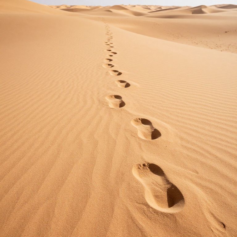 Photograph of a sunlit desert with golden-orange sand dunes. A single, winding trail of human footprints, starting from the bottom right and stretching diagonally to the top left, traverses the undulating sand. The ridges and textures of the sand are clearly visible, with the sunlight casting soft shadows. The background shows distant, gently rolling dunes under a clear sky, creating a sense of vastness and isolation. The footprints are evenly spaced, indicating a slow, deliberate pace through the desert landscape.
