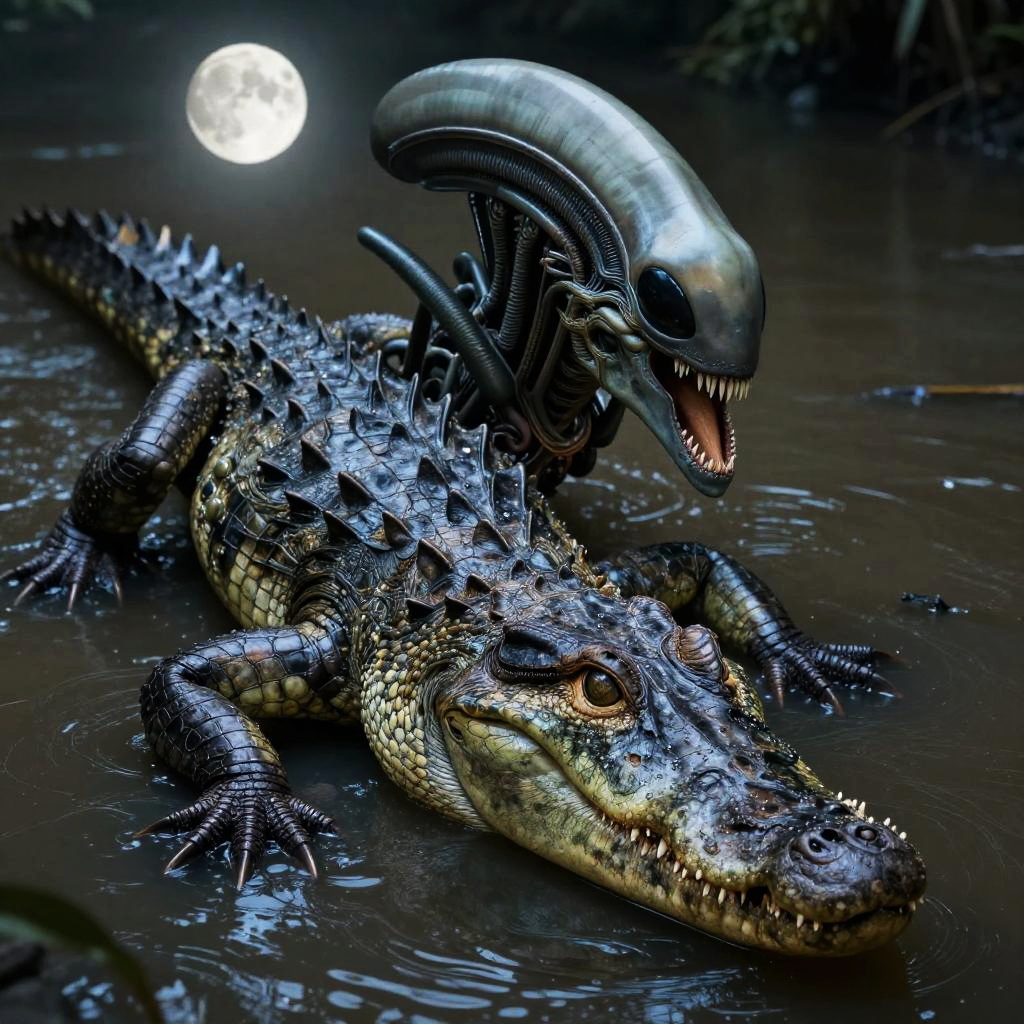 Crocodile Xenomorph in Moonlit River