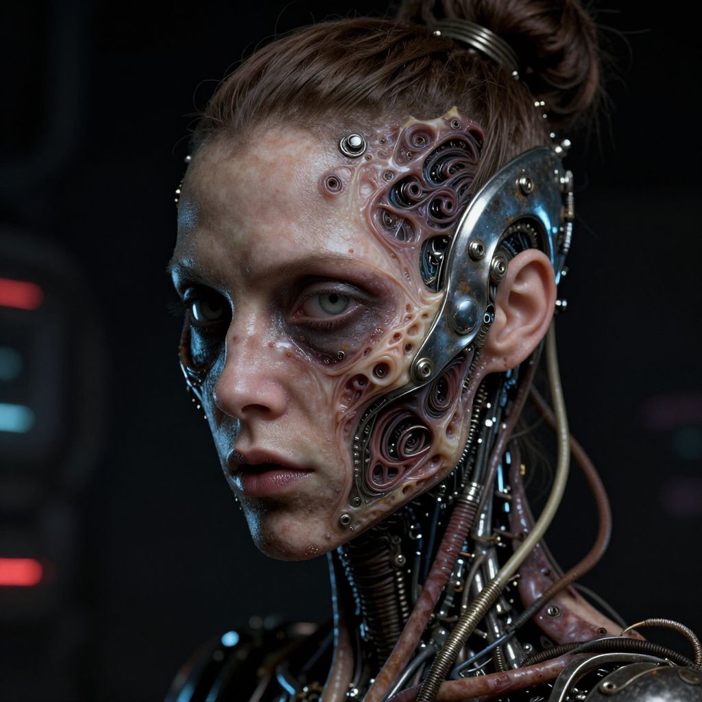 A haunting, dark portrait of a woman, her face a fusion of organic and mechanical elements in the style of H, Giger, The close-up shot reveals a biomechanical mask that has grown into her skin, a grotesque yet beautiful merging of flesh and metal, The mask appears almost alive, made from a nightmarish blend of organic tissues and cold, industrial materials — wires and cables intertwining with veins and sinew, wrapping around her jaw and temples, Metallic plates, some rusted and others gleaming, seamlessly meld into her pale, ghostly skin, creating a disturbing yet fascinating symmetry, Her brown hair, tightly bound into a knot, contrasts with the twisted metal and organic tendrils extending from the mask, some of them snaking down the back of her neck, The dark, shadowy environment barely illuminates her face, with faint neon and cybernetic lights casting eerie reflections across her biomechanical features, Her eyes, filled with cold intensity, peer out from behind the mask, showing the last traces of her humanity within the cold, biomechanical form, The fusion of flesh and machine, organic and metallic, creates an unsettling, dystopian beauty, where the boundaries between life and technology blur, The intricate detailing of the mask, with its alien, otherworldly design, captures the dark essence of Giger's biomechanical art, as the woman’s face stands frozen in a moment of both suffering and strength
