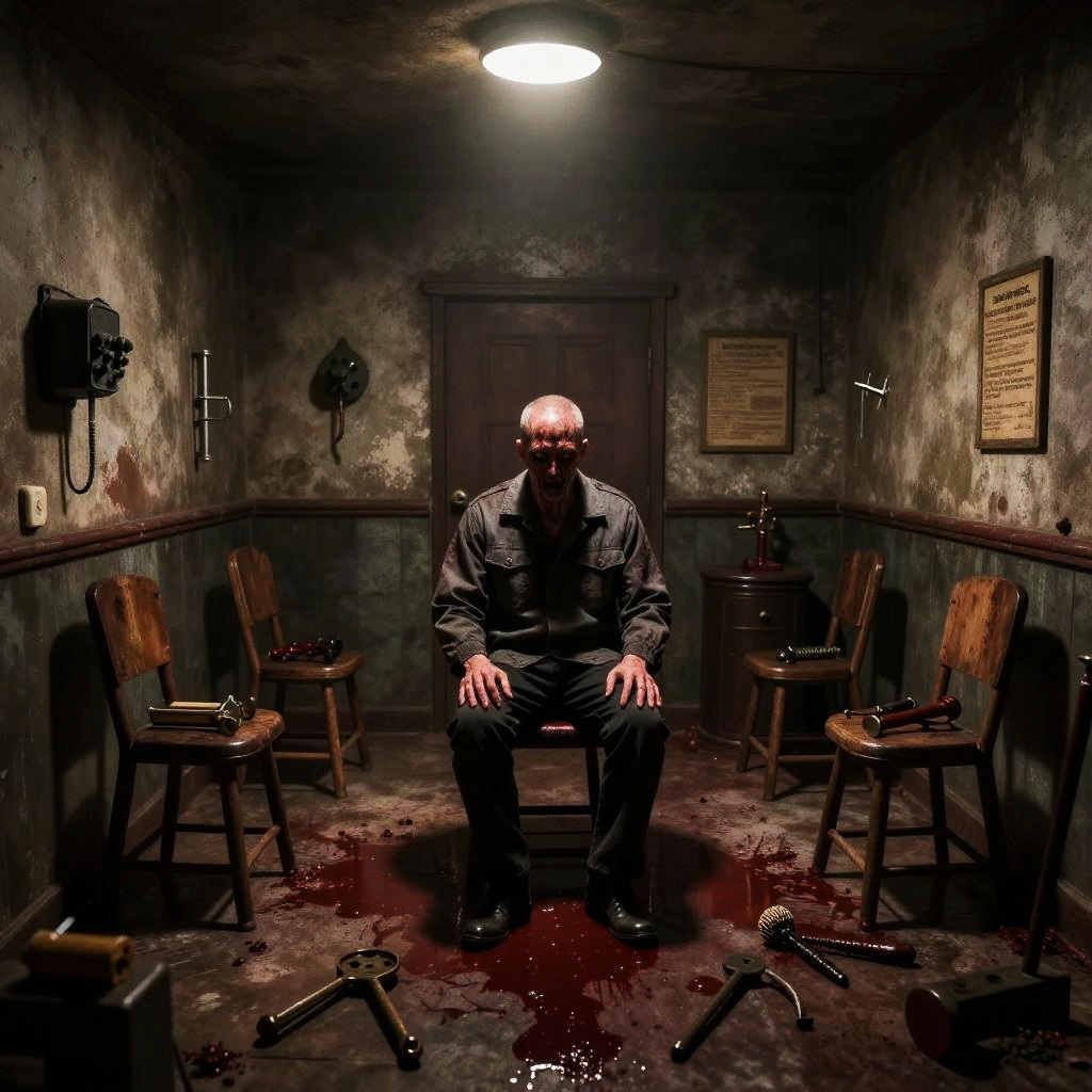 Digital art depicting a dark, grimy interrogation room with a bald, pale-skinned man seated in the center, wearing a black leather jacket and pants. His hands rest on his thighs, and his eyes are obscured by shadows. Blood pools at his feet, with several empty bullet casings scattered around. Four wooden chairs with bloodstains are positioned symmetrically around him. The walls are stained and dirty, adorned with a dark wooden door, a framed document, and a wall-mounted device. A dim overhead light casts an eerie glow, enhancing the room's foreboding atmosphere. The overall style is dark and moody, with a horror or thriller theme.