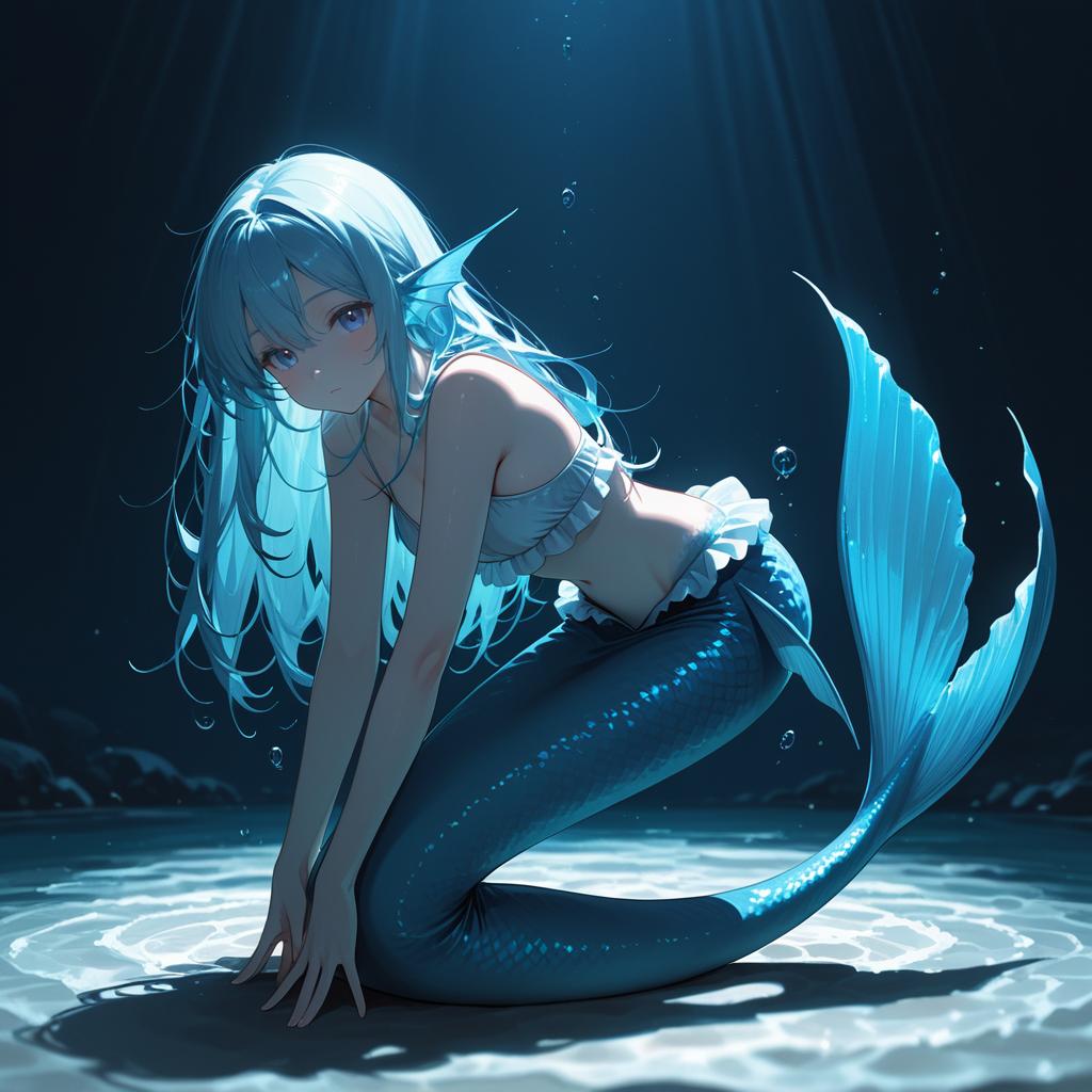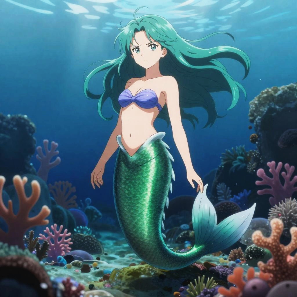 Ecchi art of merfolk siren standing confidently in a bioluminescent coral reef cavern, her teal hair flowing in the wind, intense gaze, high-detail anime rendering