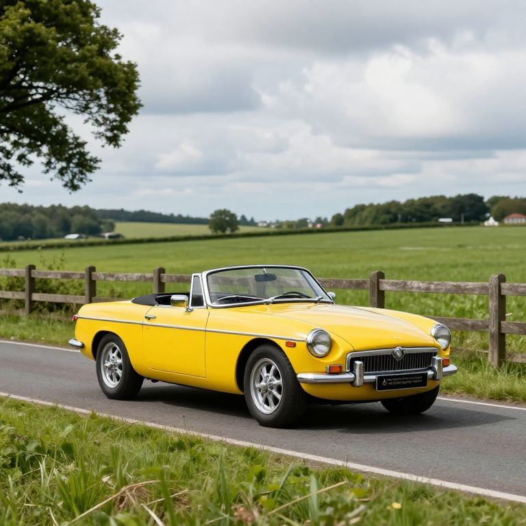 Vibrant 1974 Citron Yellow MGB roadster cruising along a scenic rural road, framed by lush green fields and a wooden fence under a partly cloudy sky.