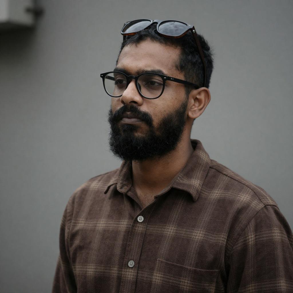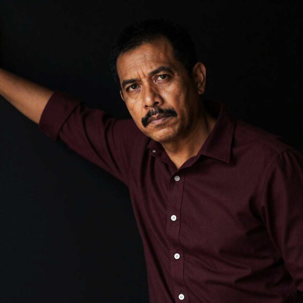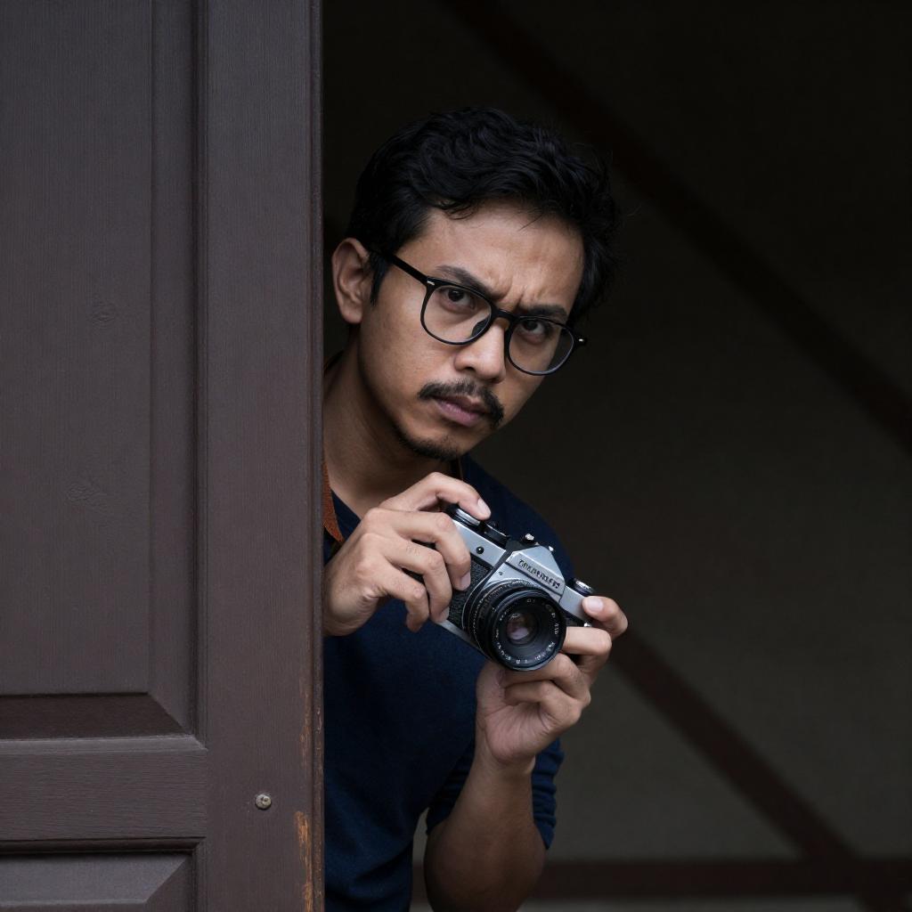 Photograph of a man with a light brown complexion, wearing a white t-shirt and a white cap, leaning through a metal door. He has a goatee and a focused expression. The door has a small window and industrial controls on the right. The background is dark and industrial. The man is centered in the frame.