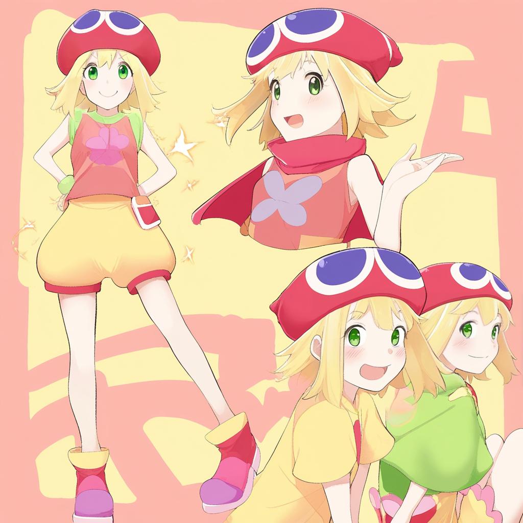Digital illustration of Amitie from Puyo Puyo featuring four different poses of a young girl with short blonde hair and green eyes. She wears a distinctive red hat with blue and white circular patterns, a pink and orange top with a flower motif, yellow shorts, red scarf, and colorful shoes. The background is a soft pastel with abstract shapes.