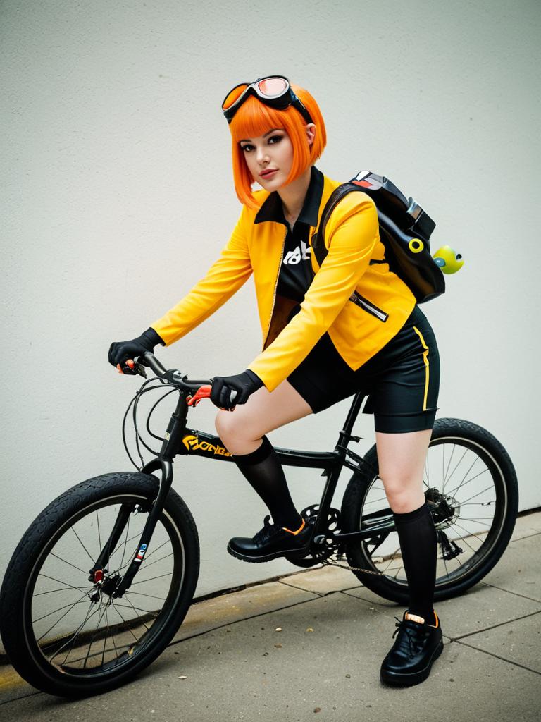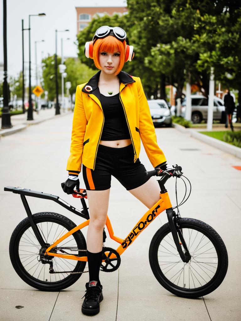 Photo-realistic full-body image of a female cosplayer dressed as Agent 4 from Splatoon, featuring orange tentacle hair and orange-yellow themed outfit. She wears a yellow jacket with black trim, black bike shorts with orange stripes, black sleeveless top, and black shoes. The cosplayer is standing confidently next to a bright orange and black bicycle on a city sidewalk, with greenery and urban elements in the background. She has distinctive large headphone-style headgear and goggles on her head, complementing the Squidbeak Splatoon theme.