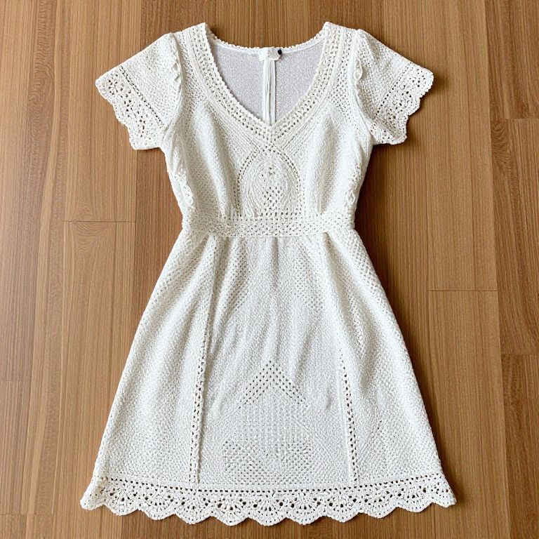 One of a kind vintage white crochet dress featuring intricate handwoven patterns, short sleeves, a v-neckline, and scalloped hem, laid flat on a wooden surface.