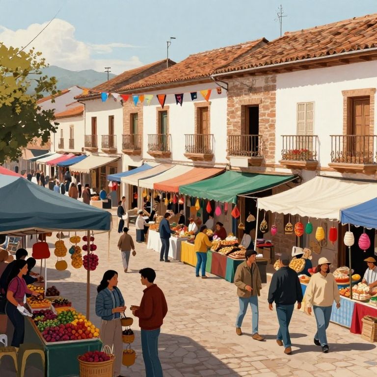 Salinas town street scene, vibrant local market with colorful stalls, traditional architecture, lively crowd interacting, warm daylight, rustic buildings with tiled roofs, festive atmosphere, dynamic and detailed urban illustration