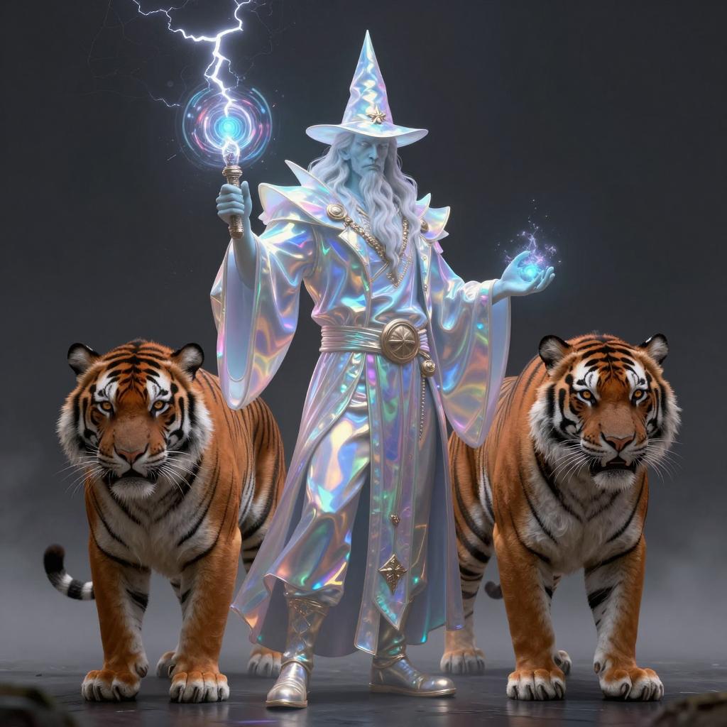 A highly detailed, photorealistic image of a powerful wizard dressed in an iridescent robe and pointed hat, holding a staff emitting lightning and a glowing orb. He is flanked by two realistic tigers standing on either side. The scene is set against a dark, foggy background with vibrant colors and magical effects, conveying a fantasy theme.