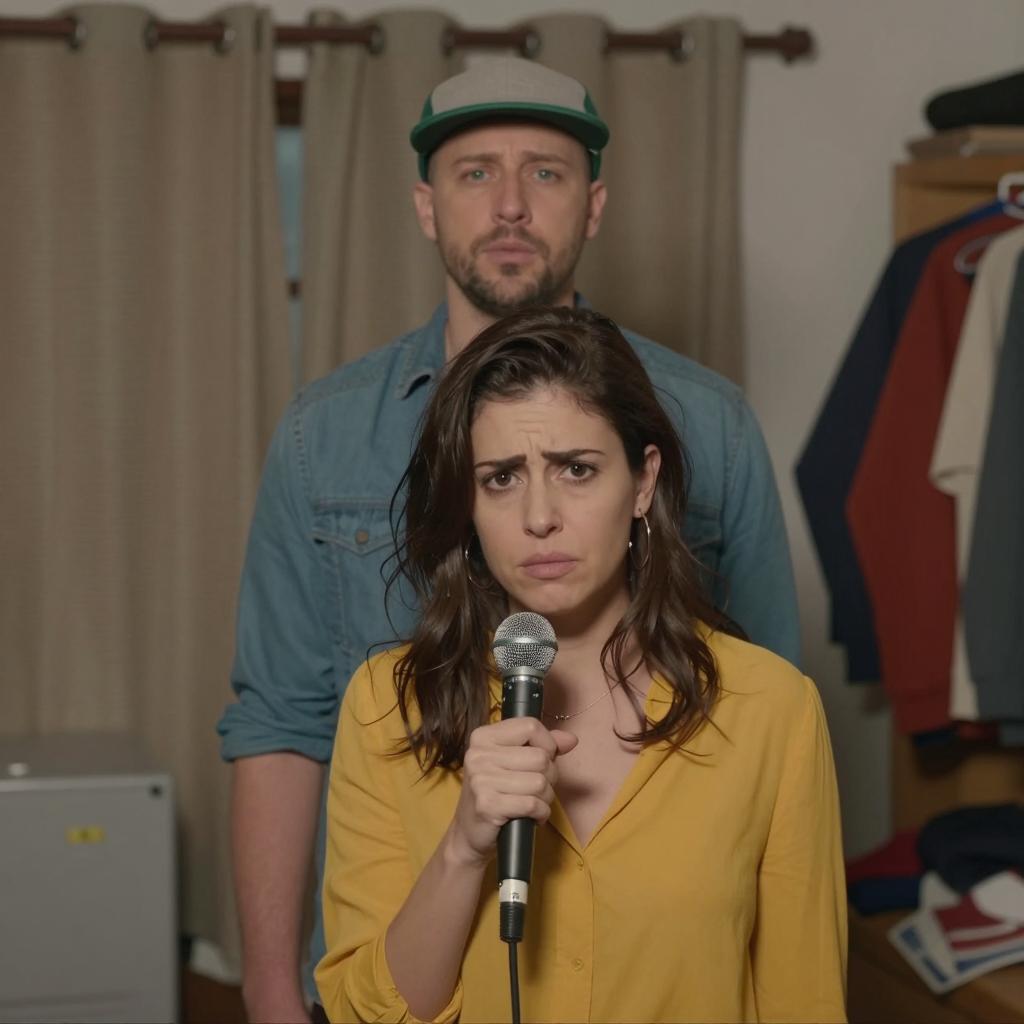A man wearing a blue denim shirt and green and grey cap stands behind a woman with dark brown hair dressed in a yellow blouse. The woman holds a microphone and has a slightly annoyed facial expression. They are indoors in a cluttered room with beige curtains and clothes hanging in the background.