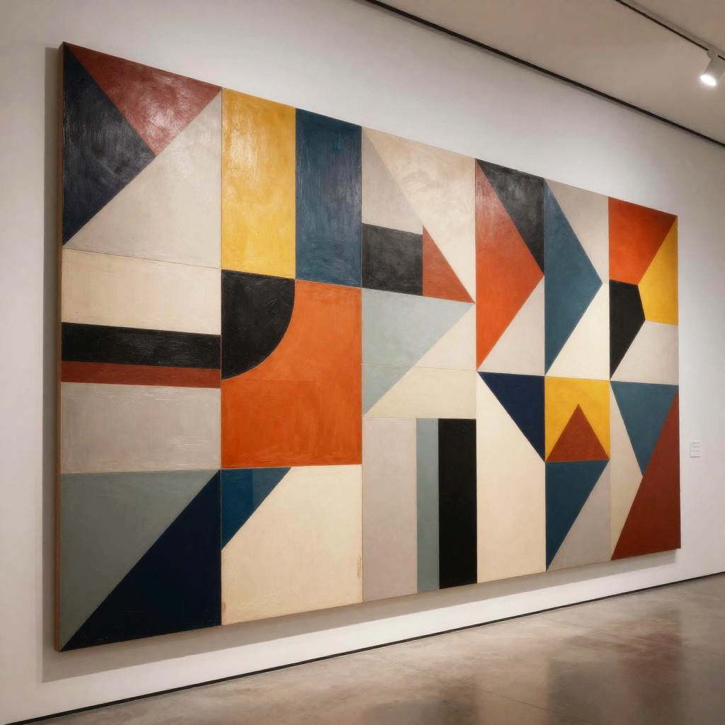 Abstract panneaux art installation in a modern gallery space, geometric shapes and vivid colors arranged in intricate patterns on large panels, dramatic shadows and bright spotlighting, high detail and contemporary aesthetic