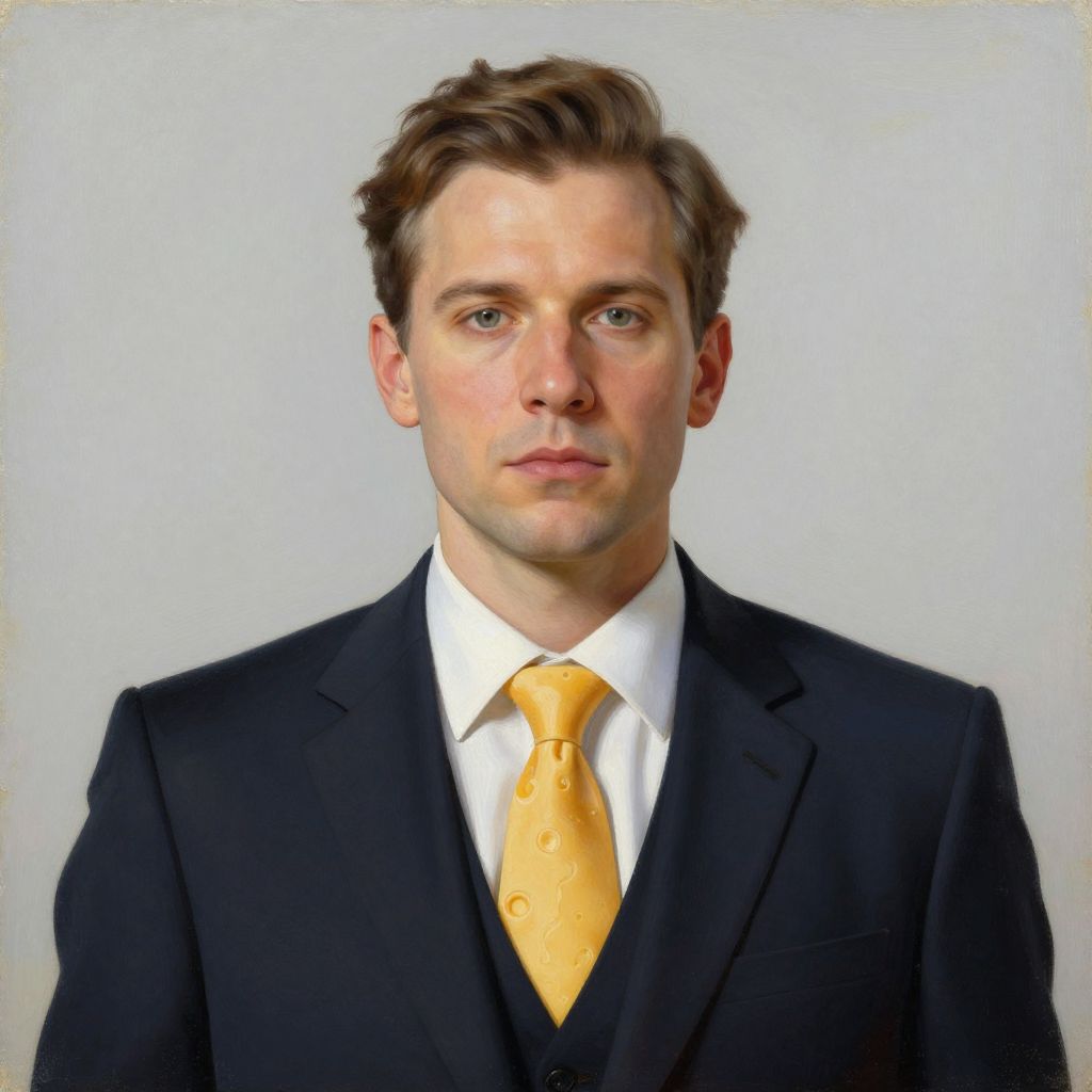 Digital portrait of a serious, fair-skinned man with dark brown hair, wearing a black suit, white shirt, and black tie, against a gray