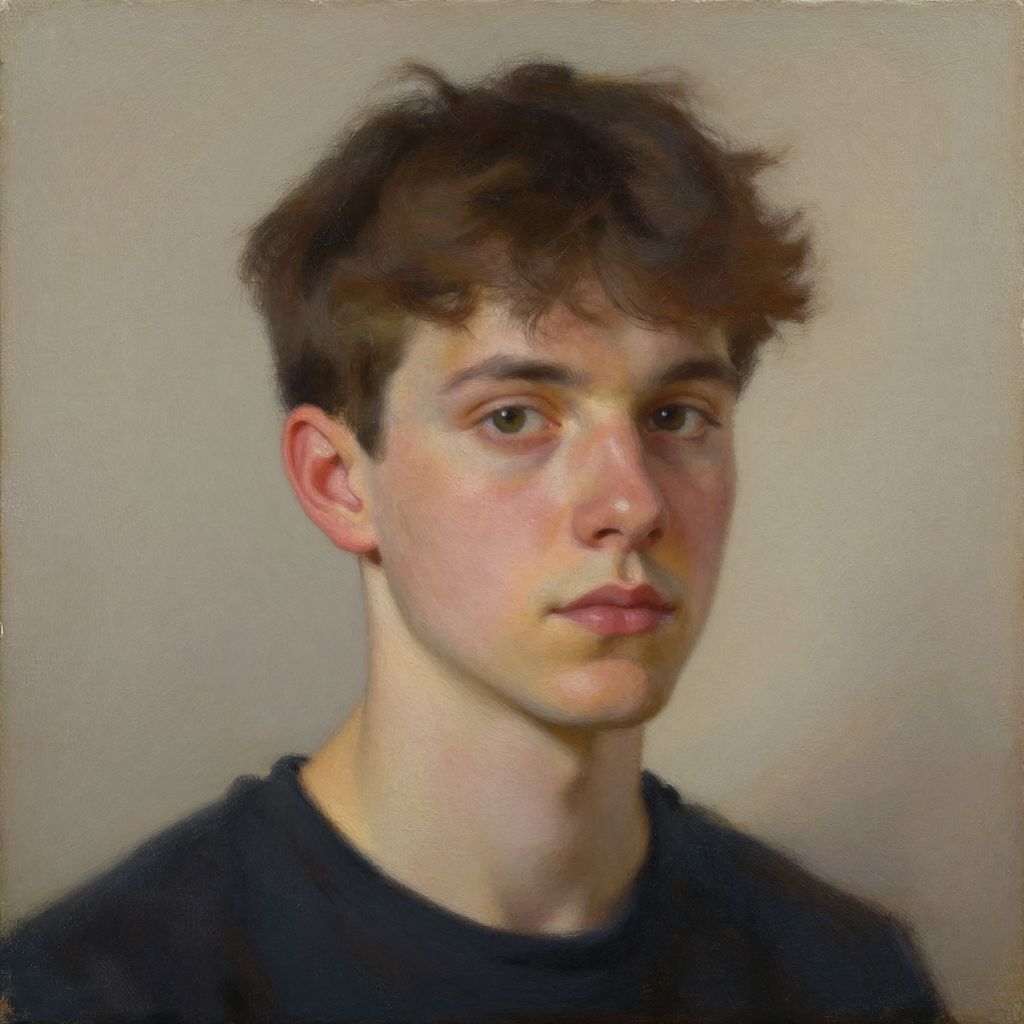 This is a digital painting of a white man with short, dark brown hair, wearing a black suit, white dress shirt, and black tie. His skin is fair with a slight reddish tint on his cheeks, and he has a serious, slightly pensive expression. The background is a plain, solid gray, which contrasts with his darker clothing. The painting has a realistic style with smooth, detailed brushstrokes that highlight the textures of his hair and clothing. The lighting is even, casting minimal shadows, emphasizing the subject's facial features and attire.