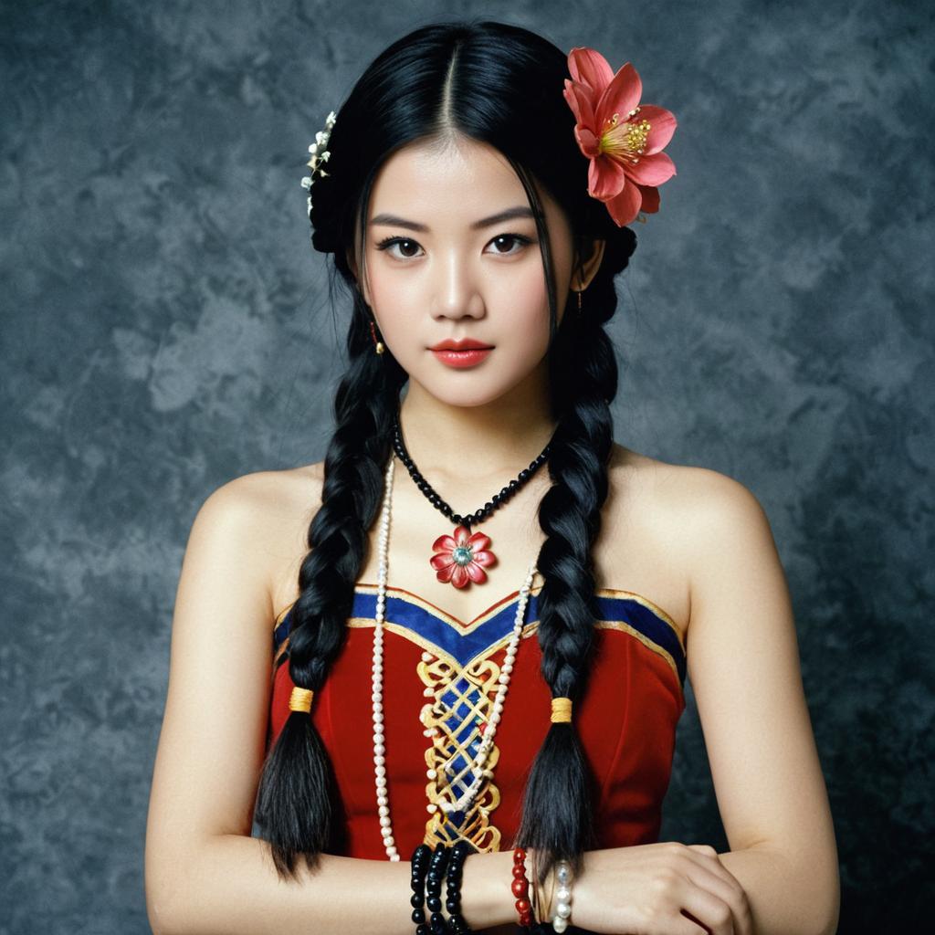 Ashitaka costume,1girl, jewelry, braid, necklace, solo, long hair, bracelet, black hair, hair ornament, flower, hair flower, realistic, standing, closed mouth