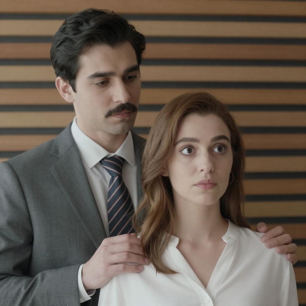 Movie poster of a man with dark hair, intense gaze, in a blue suit, leaning over a woman with dark hair, closed eyes, wearing a light blue dress. Man's hand grips her shoulder. Yellow border. Dark background.