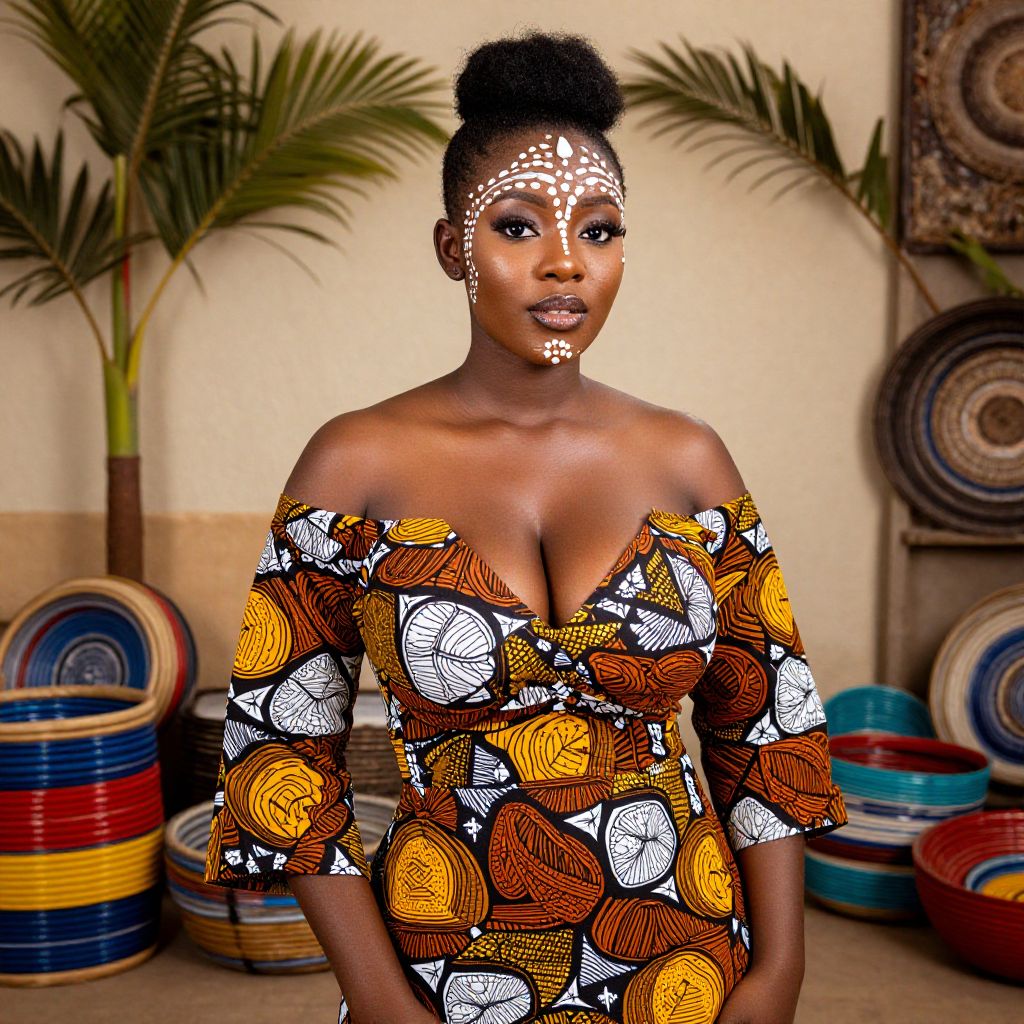 An elegant African woman with high cheekbones, smooth skin, and a traditional face paint pattern wearing a richly patterned ankara outfit woman costume, posing in front of a vintage market wall with palm trees and handwoven baskets, vibrant colors and soft natural lighting, photo-realistic style. The woman has big tits and cute face