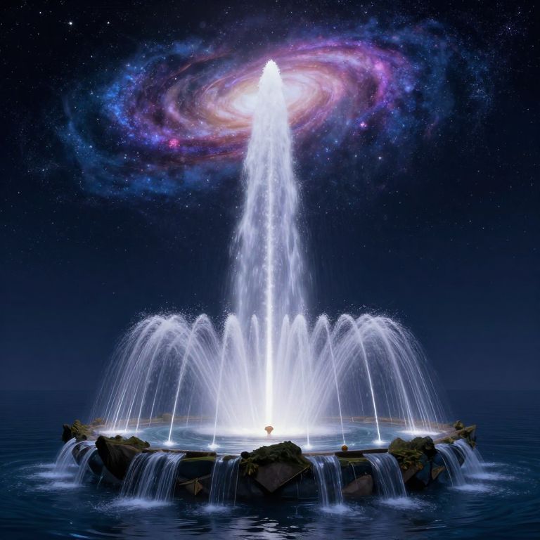 A fountain at the center of a floating island produces rivers of pure light that flow upward into the stars, nourishing entire galaxies.
