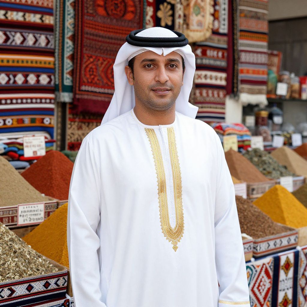 Photograph of a Middle Eastern man standing in a bustling marketplace. He has dark hair, a trimmed beard, and wears a white traditional long-sleeve shirt with a brown embroidered vest, and a white turban. The background shows blurred figures of other men in white traditional attire, colorful textiles hanging, and vibrant stalls with spices and goods. The man's expression is neutral, and the marketplace is brightly lit, creating a lively atmosphere. The image has a vibrant, slightly saturated color style.