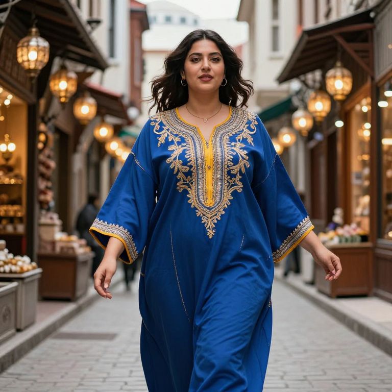 A curvy female with olive skin and dark, wavy hair, wearing a richly detailed, hand-embroidered kaftan in indigo blue with saffron trim, standing in a bustling city alley in Istanbul, where lanterns glow softly and old wooden shops line the walls, the kaftan flaring slightly in the breeze.