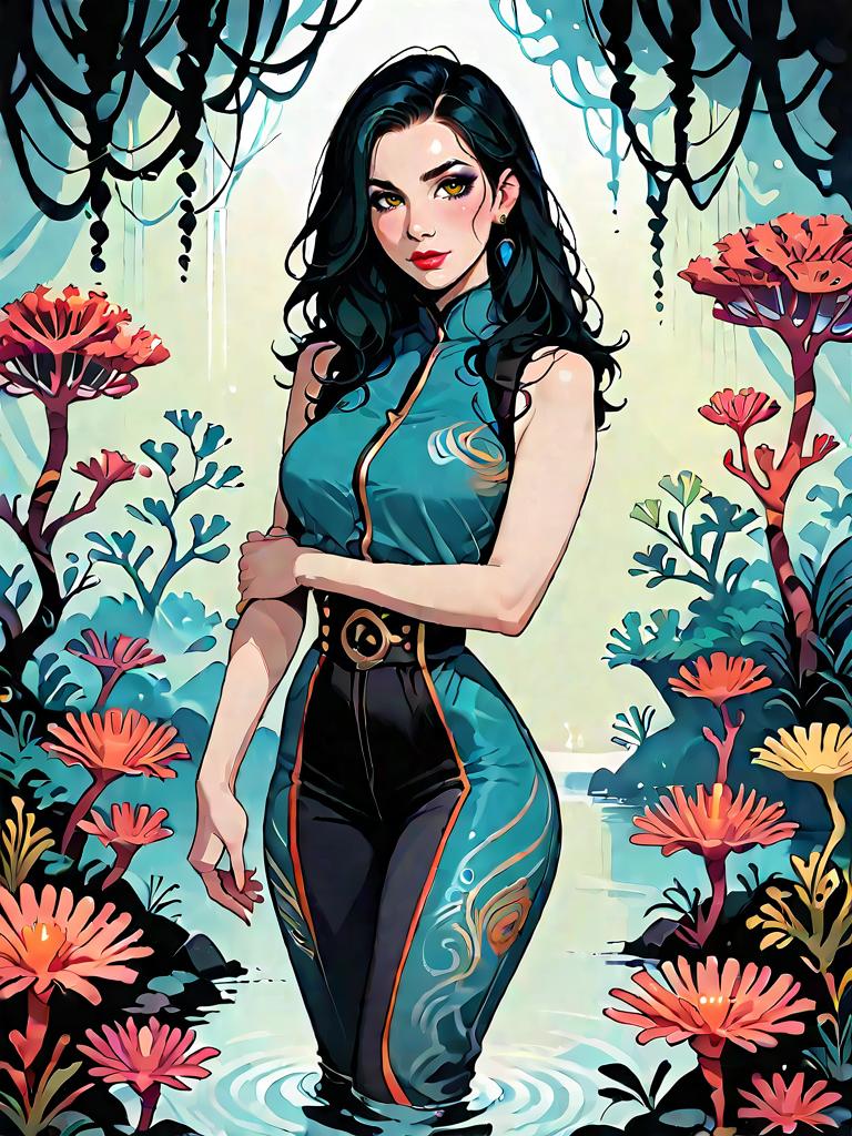 1girl, woman wearing sleeveless wide-leg belted jumpsuit with wrap-front neckline and bold abstract geometric print in deep green base with coral and beige pattern on tan-skinned woman with glam waves over one shoulder posed standing straight with both hands in pockets, feet apart in matte midnight blue wall with minimal floor shadow, even high-key lighting emphasizing print details, modern editorial fashion photography, high resolution, ultra-detailed
