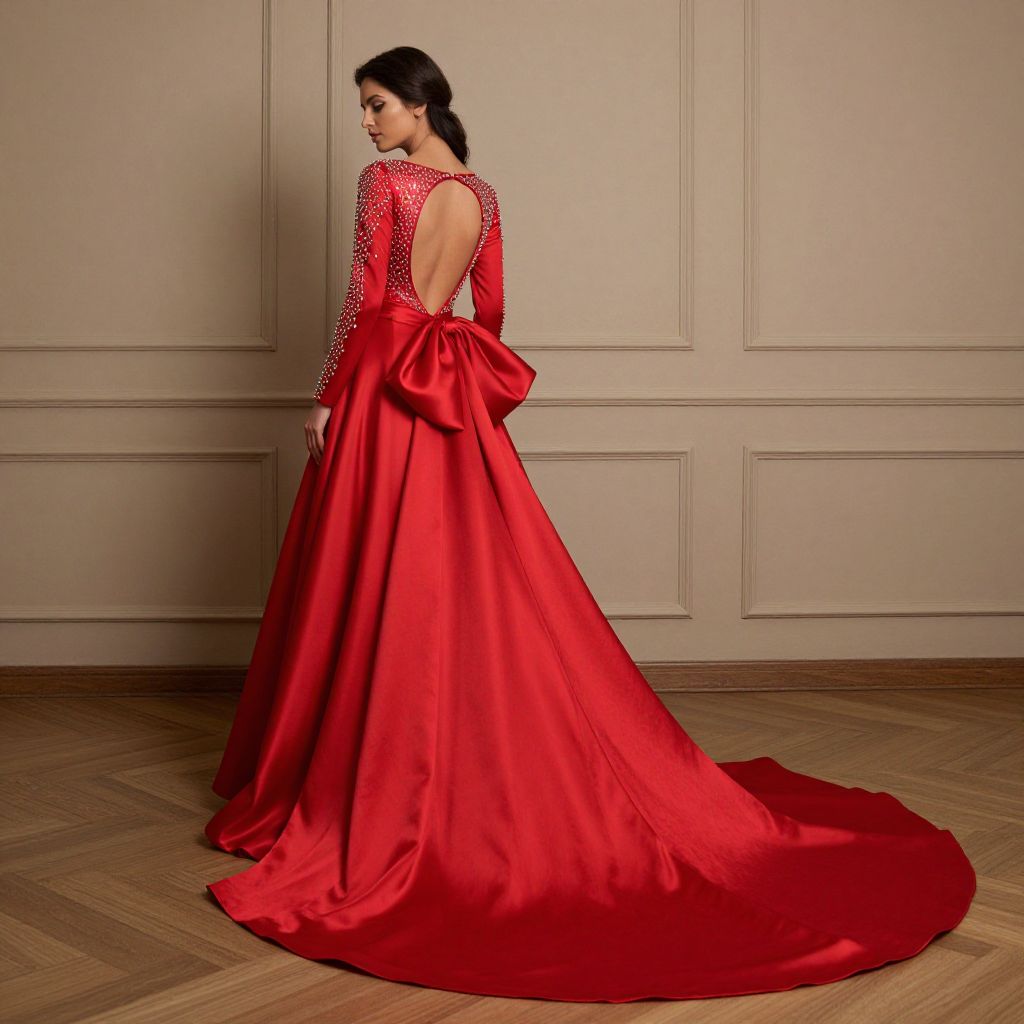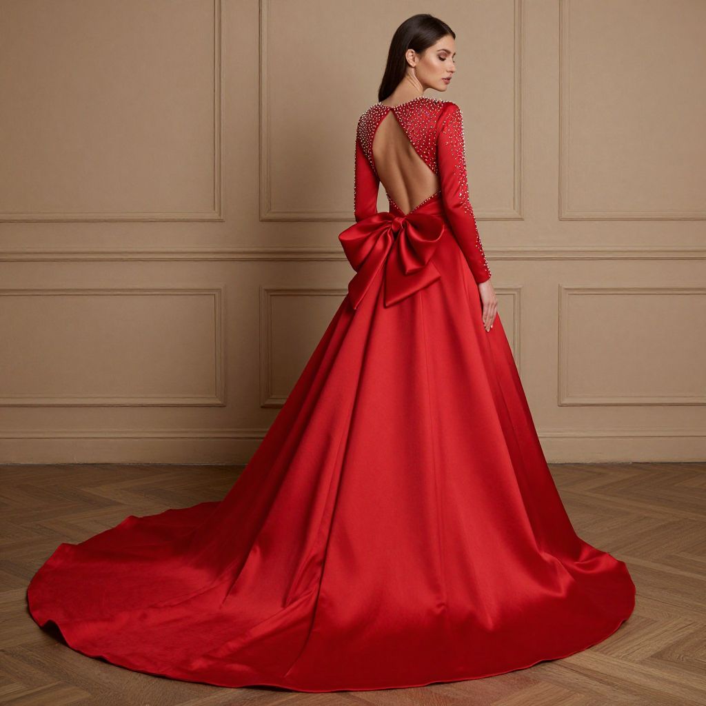Elegantly poised against a classic paneled wall, a woman showcases a striking Arabic red A-line wedding dress featuring long sleeves adorned with sparkling crystals, a dramatic open back, and a voluminous bow accentuating the waist, complemented by a flowing train that cascades gracefully onto the floor.