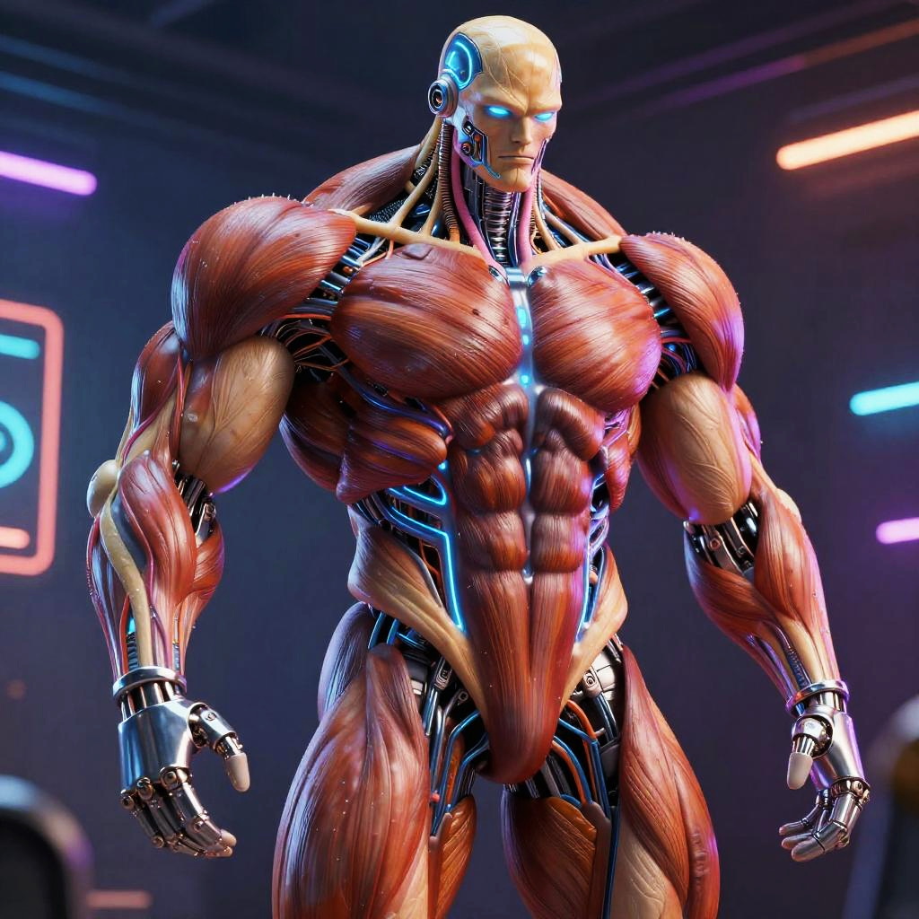 Bodybuilding AI muscle design, creative fusion of organic muscle tissue and digital circuitry, futuristic robotic bodybuilder on a neon-lit stage, complex mechanical muscles and veins pulsing with energy, vibrant color palette, 3D render style