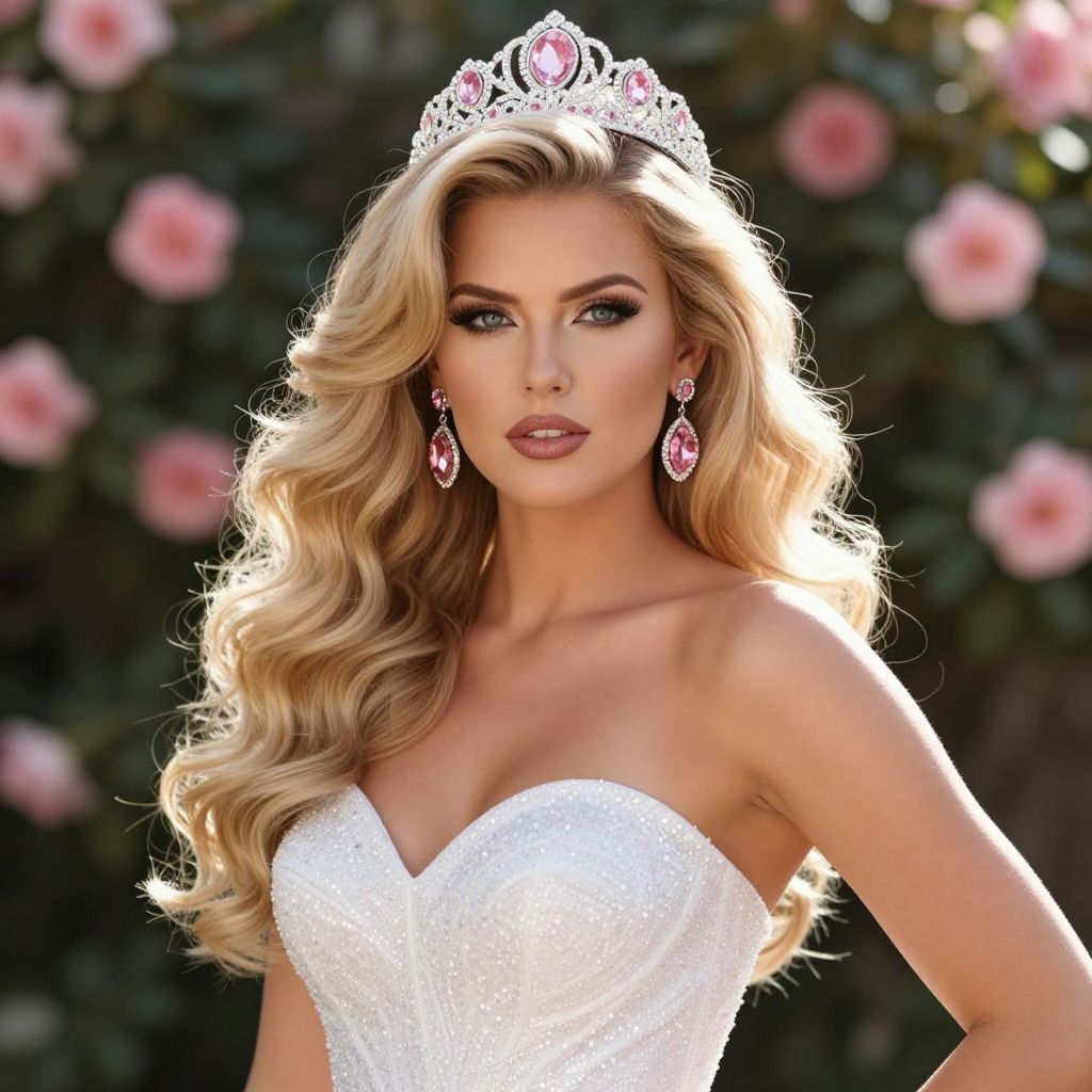 Photograph of a beautiful blonde woman with long, wavy hair wearing a sparkling white strapless dress and a silver tiara with a pink gem. She has pink gemstone earrings and stands in front of a blurred background of pink roses. Her makeup is glamorous, and she has a confident, slightly serious expression. The sunlight enhances her golden hair and the dress's glittery texture.