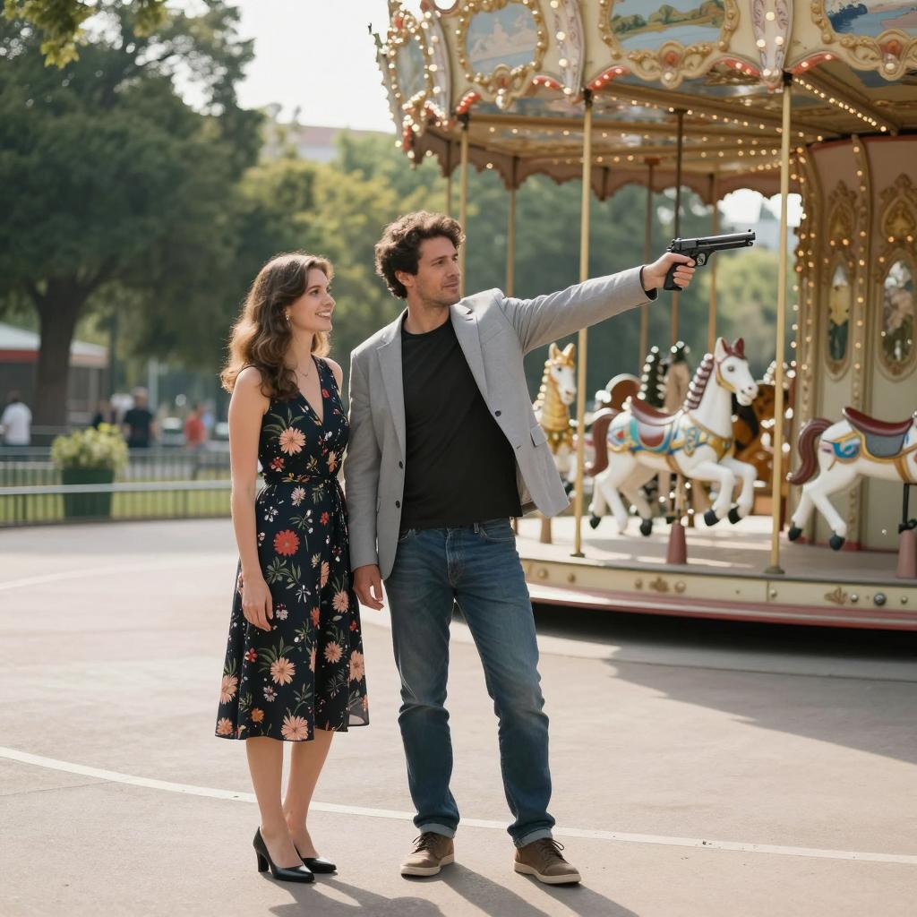 A curly-haired man wearing a blue denim shirt and a woman with short brown hair dressed in a white tank top and blue jeans are in a sunlit greenhouse. The man is holding and aiming a handgun with his right hand. The woman stands near a window with a handgun pointed to her head. The greenhouse features wire mesh walls and various potted plants, with sunlight filtering through the glass ceiling.