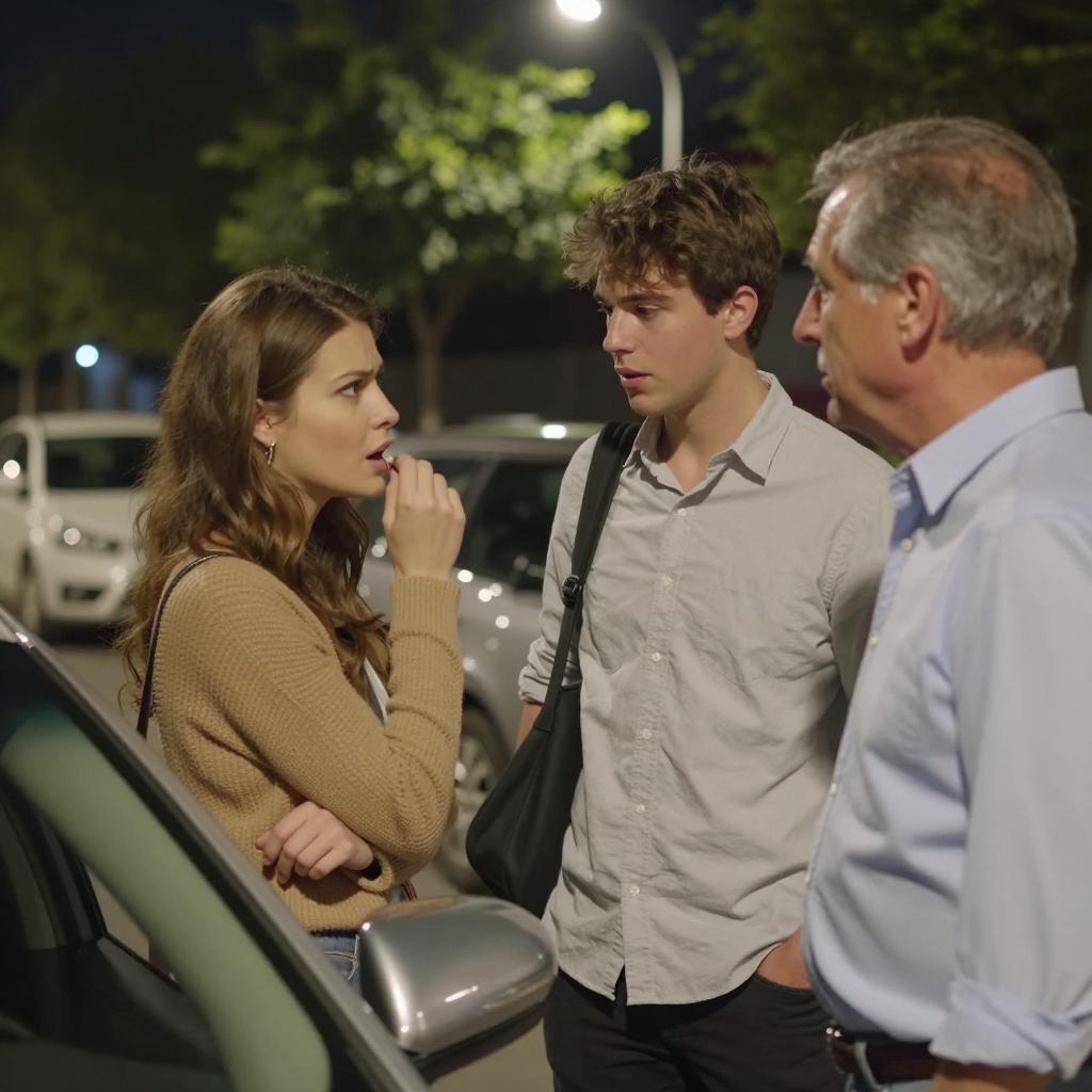 Nighttime street scene. Three people. Woman with long brown hair, tan sweater, leaning on car, talking to young man with short brown hair, light gray shirt. Older man with gray hair, blue shirt, standing to the right. Tree and streetlights in background. Cars parked on the left. Woman's hand near mouth, intense expression. Young man's mouth slightly open, focused. Older man's expression neutral.