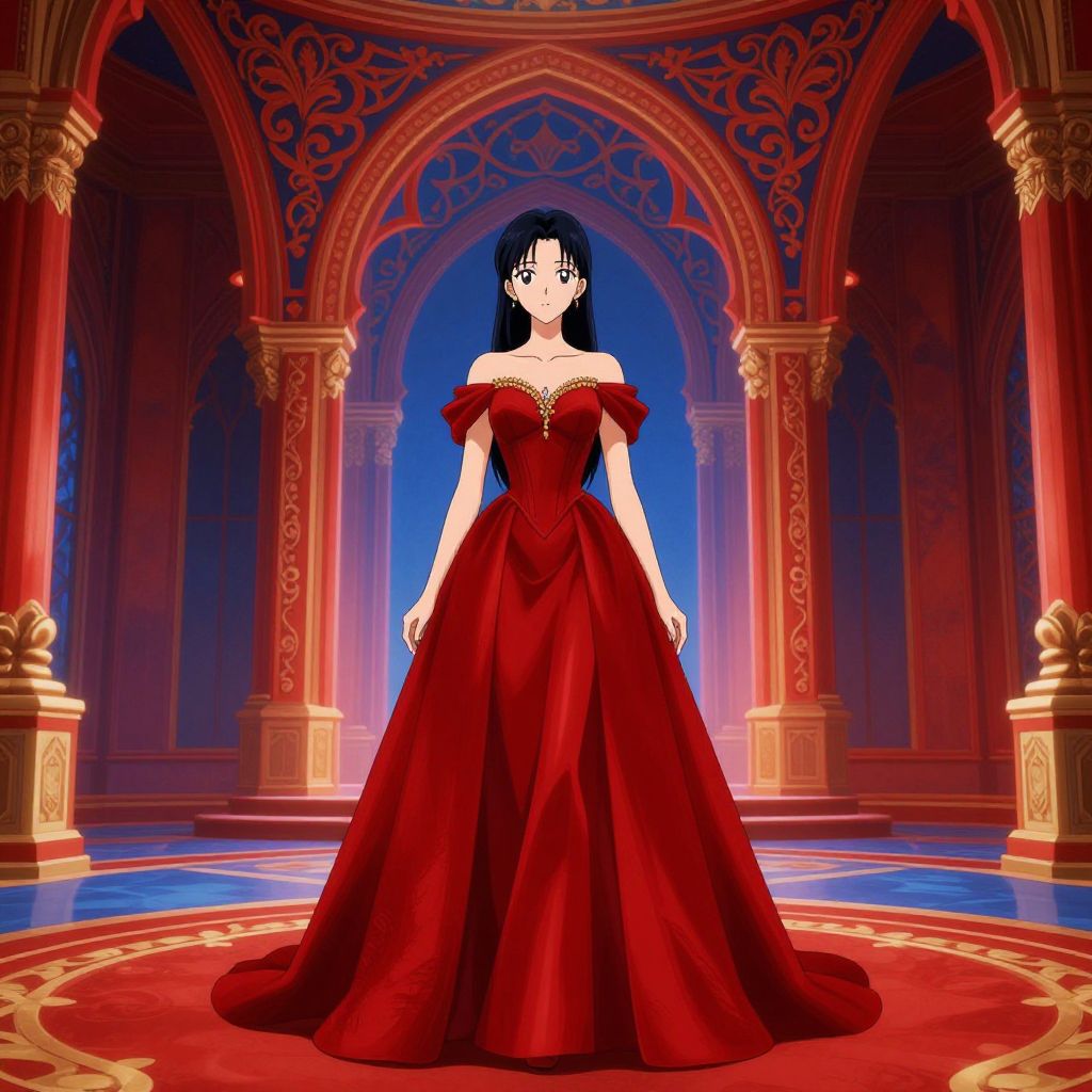 Digital illustration of a woman with pale skin and black hair in a red off-shoulder ball gown, standing in an ornate, archway-lined
