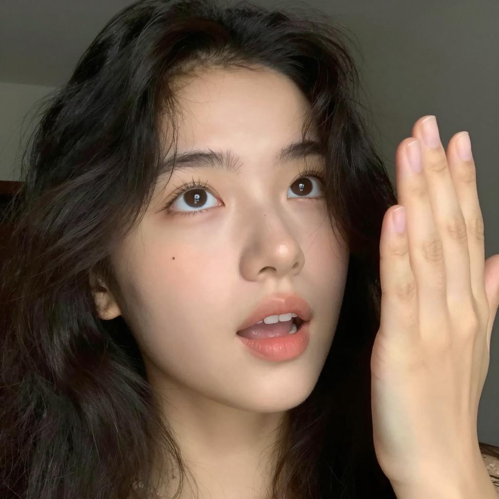 Close-up photograph of a young woman with light skin, dark curly hair, and brown eyes looking upward. Her mouth is slightly open, and she raises her right hand with fingers extended. Dim, dark background. One visible mole on her left cheek.