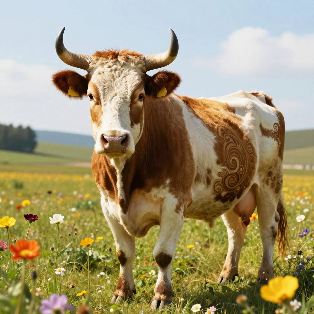 Futa cow standing in a sunlit meadow, detailed fur texture, majestic horns, vibrant flowers surrounding, fantasy art style, soft glowing light, intricate patterns on hide