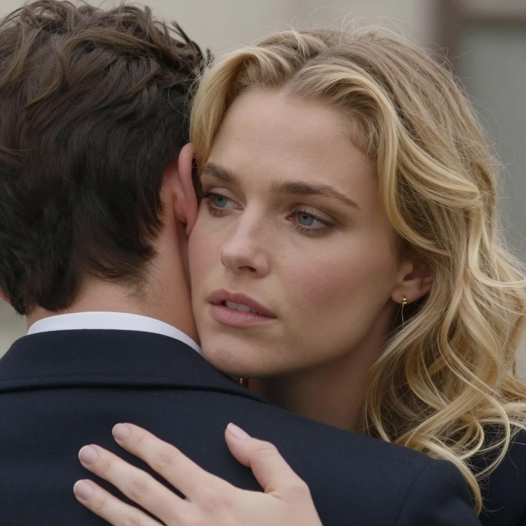 Woman with curly blonde hair and a low-cut, sequined dress stands in front of a window with diamond-patterned glass. She has a serious expression. A man with dark hair and a checkered shirt is seen from behind, facing her. Both are indoors.