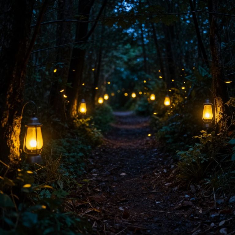 Photograph of a dimly lit forest path at night, illuminated by warm, glowing lanterns hanging from trees, creating a magical, serene ambiance.