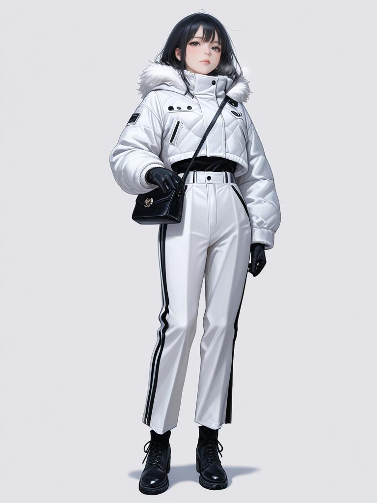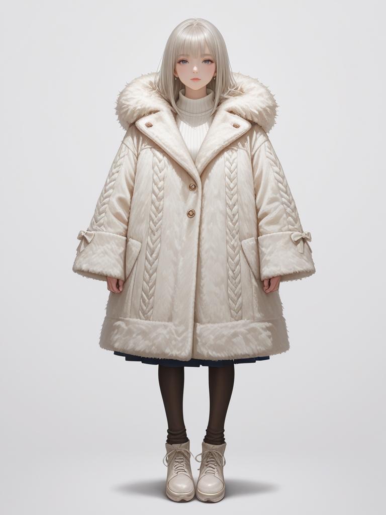 1girl, realistic face, full body shot, Woman, luxe winter style, cream-colored faux fur coat, mid-length, wide notched lapels, straight cut, long sleeves, concealed front closure, plain white top visible underneath, white background.