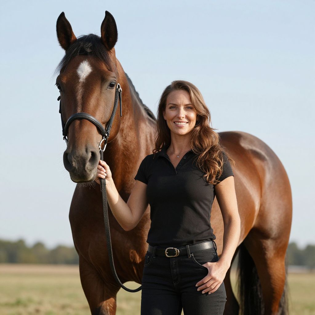 Woman standing confidently beside a majestic brown Andalusian horse, holding its reins while smiling warmly in an open field under a clear sky.