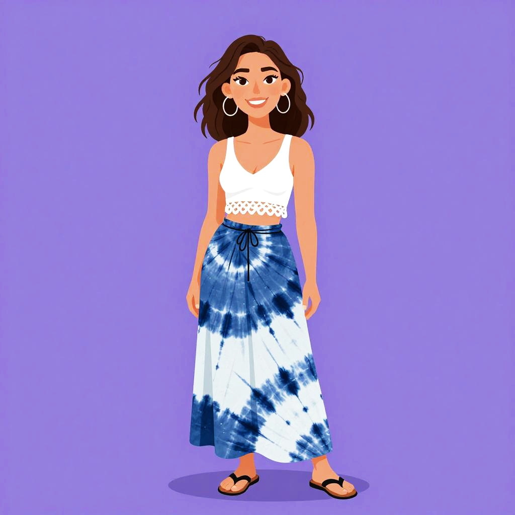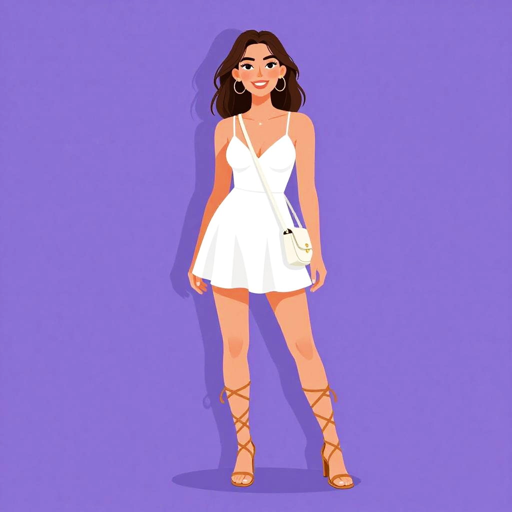 Woman with pretty face and pretty hair. smiling Woman, bohemian chic, white tiered maxi dress with lace detailing, sleeveless, low-cut neckline with tie-up detail, sheer fabric with textured stripes, black slide sandals with a minimalist design, neutral studio background. --sref 1467