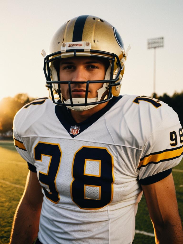 Football player in stylish gear, photorealistic outdoor portrait, golden hour