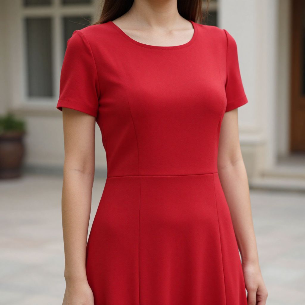 Photograph of a woman from the shoulders to the hips, wearing a vibrant red, short-sleeved, A-line dress with a round neckline. The dress is fitted at the waist and flares out slightly. Her arms are relaxed by her sides. She has light skin and long, straight brown hair that is not visible in the frame. The background is blurred, showing a white building with windows and a potted plant on a paved area. The lighting is natural, highlighting the dress's color and texture.