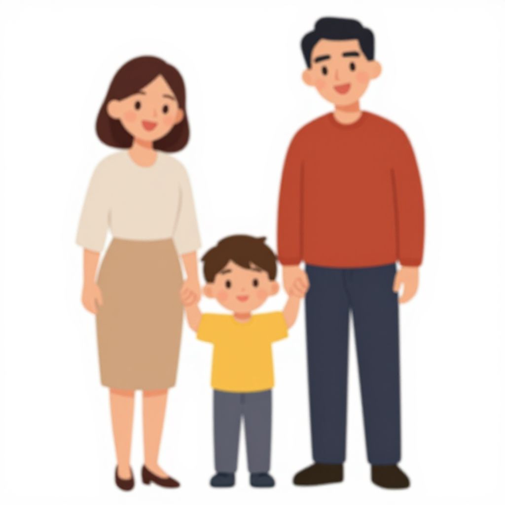 Family clipart depicting three individuals—a smiling woman in a beige top and skirt, a man in a red shirt and dark pants, and a child in a yellow shirt and gray pants—standing together with the child holding hands with both adults, all set against a plain white background.