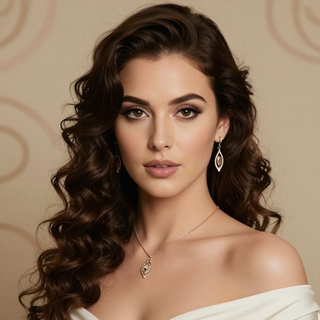 The image depicts a highly detailed and realistic portrait of a woman, reminiscent of the art style of Gil Elvgren. Her hair is styled in elegant, intricate curls, cascading down her shoulders in a lush, dark brown hue. The woman's eyes are strikingly beautiful, with long, meticulously applied eyelashes and a gaze that seems to pierce the viewer. Her skin is smooth and flawless, with a healthy, natural glow. She wears a delicate necklace with a small, intricate pendant, and matching earrings that dangle gracefully from her ears. The neckline of her garment is wide and off-the-shoulder, revealing a portion of her collarbone and clavicle. The background is a soft, warm beige, adorned with subtle, abstract patterns that complement the overall composition. The lighting is soft and diffused, highlighting the woman's features and the texture of her hair and skin. The overall effect is one of timeless beauty and elegance, with a strong emphasis on the intricate details and the interplay of light and shadow.