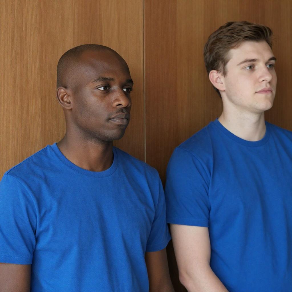 Photograph of two men in blue shirts, one with a shaved head and dark skin, the other with light brown hair and fair skin, standing against a wooden wall. The man with brown hair looks to the side with a neutral expression. The man with a shaved head is partially out of frame.