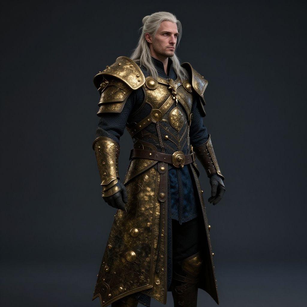 Photograph of a tall, white-haired man in elaborate, medieval-style gold armor with intricate designs and large, circular embellishments on the shoulders and chest. He wears a long, black, ornate tunic beneath the armor and black gloves. The man stands confidently against a dark, gradient background, looking slightly to the right with a serious expression. The armor's texture is metallic and reflective, contrasting with the matte finish of the tunic. The lighting emphasizes the gold armor, casting subtle shadows on the black clothing. The overall style is fantasy or epic, evoking a sense of nobility and strength.